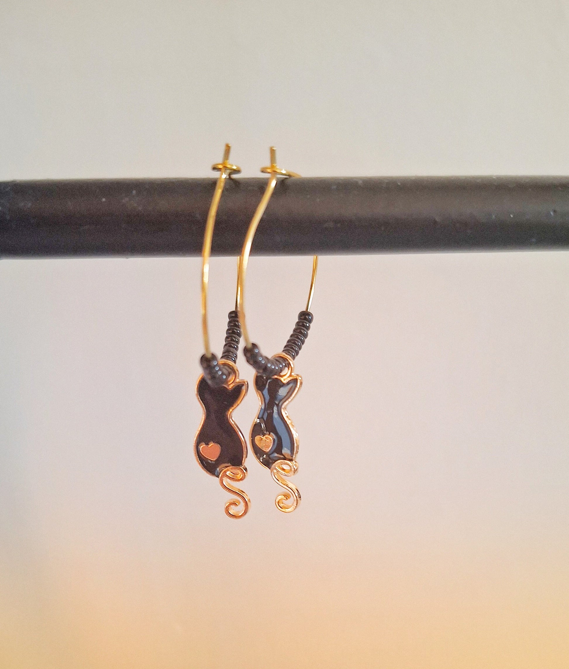 Indulge in the perfect blend of sophistication and feline allure with our 25mm Hoop Earrings. Crafted from radiant gold-colored brass, these earrings are a timeless accessory. They are adorned with repurposed black glass seed beads, creating a captivating contrast of light and dark. The star attraction is the gold and black enamelled cat charm, a symbol of independence and playfulness. These earrings effortlessly combine elegance with a touch of whimsy, making them a charming addition to your jewelry collection.