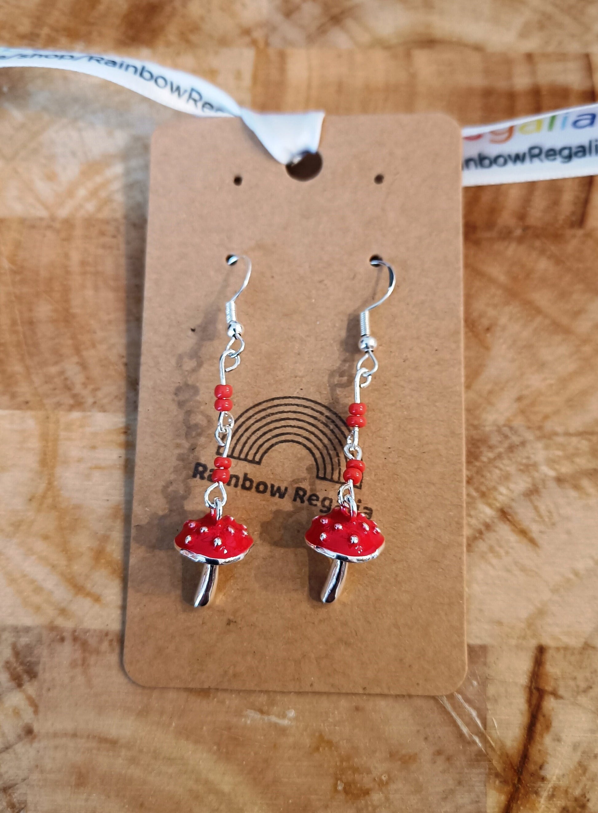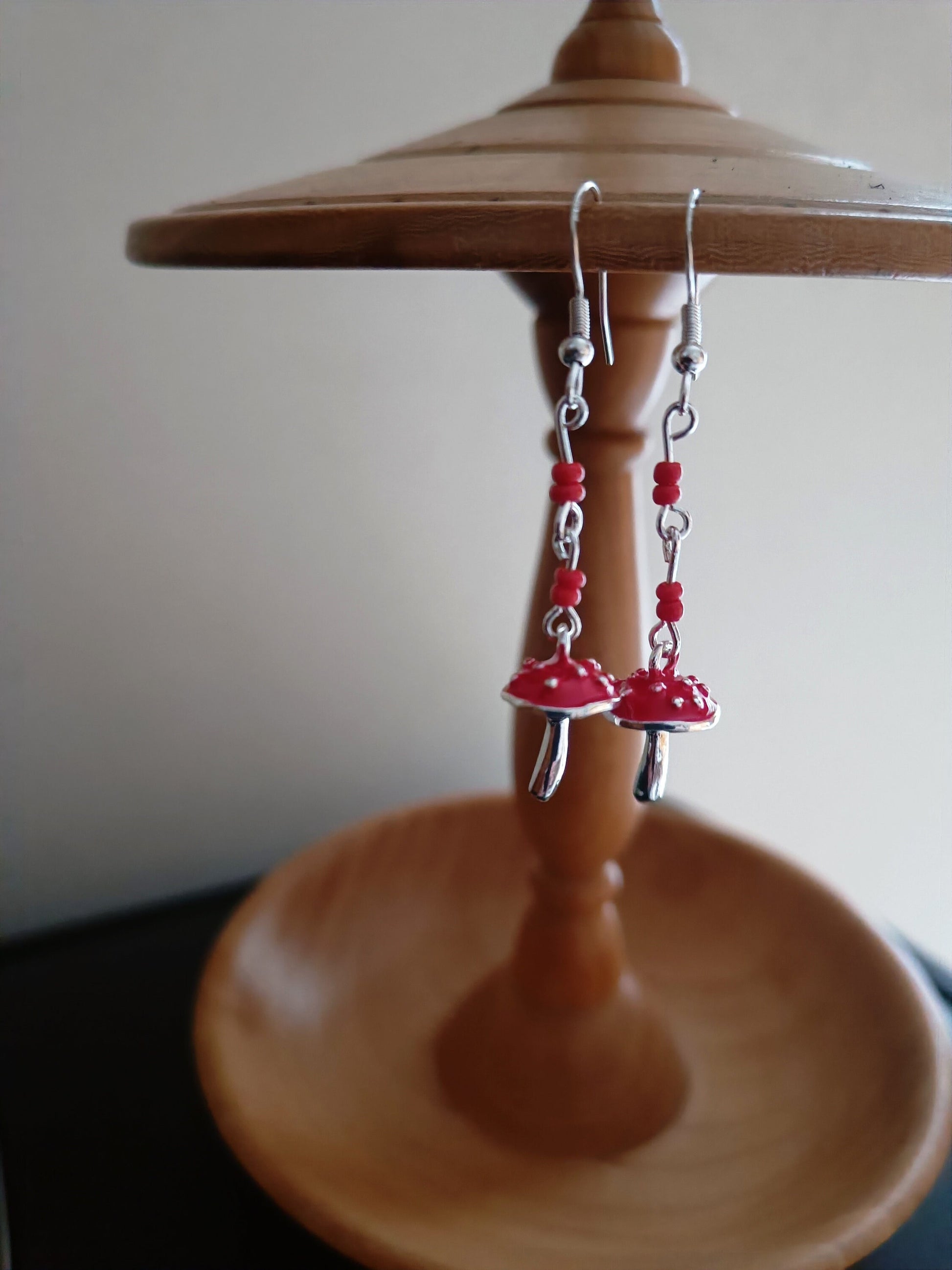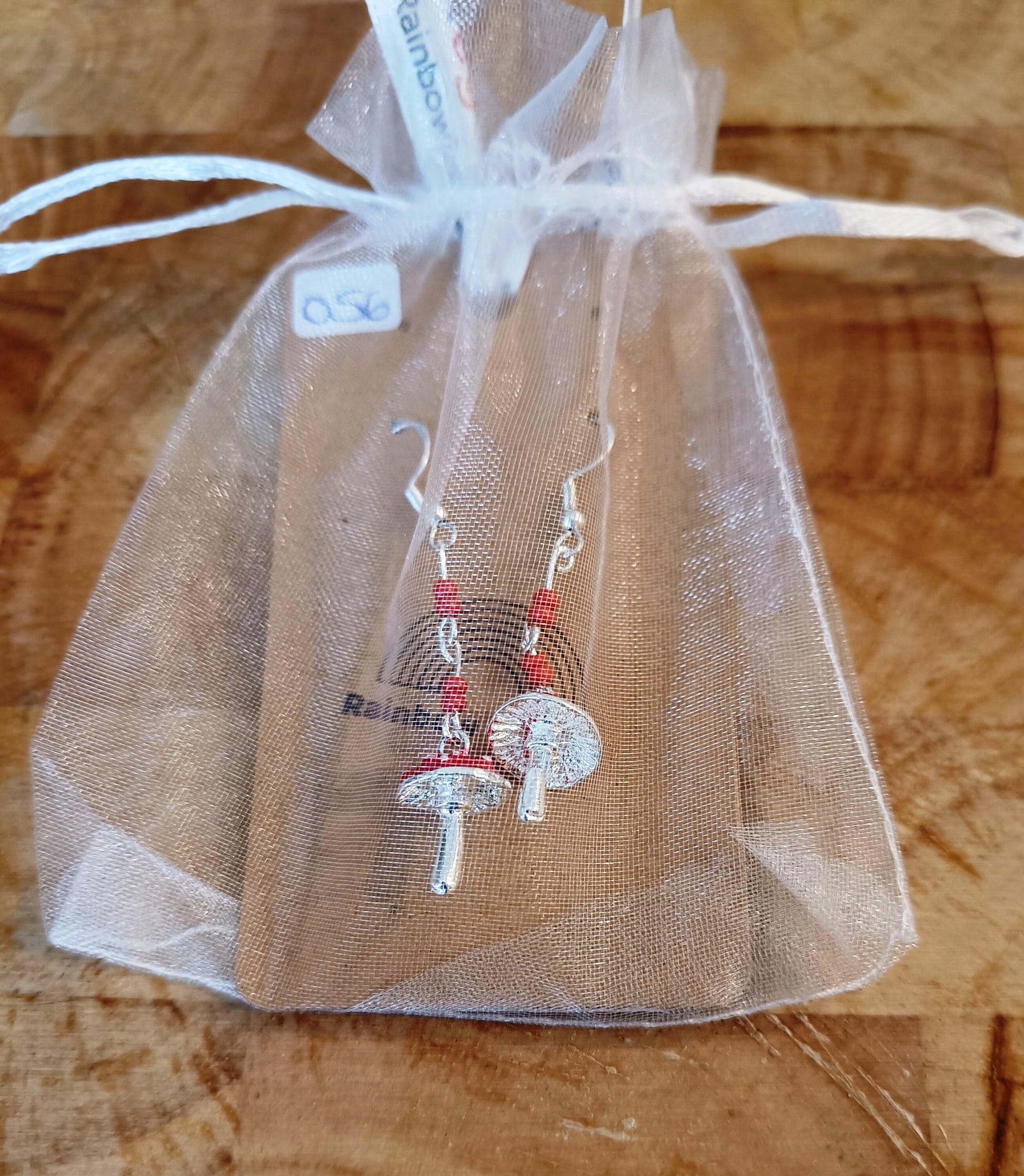 These earrings are made using repurposed red glass seed beads and feature beautifully detailed toadstool charms. They are hung from sterling silver ear hooks with soft rubber backings for extra security.