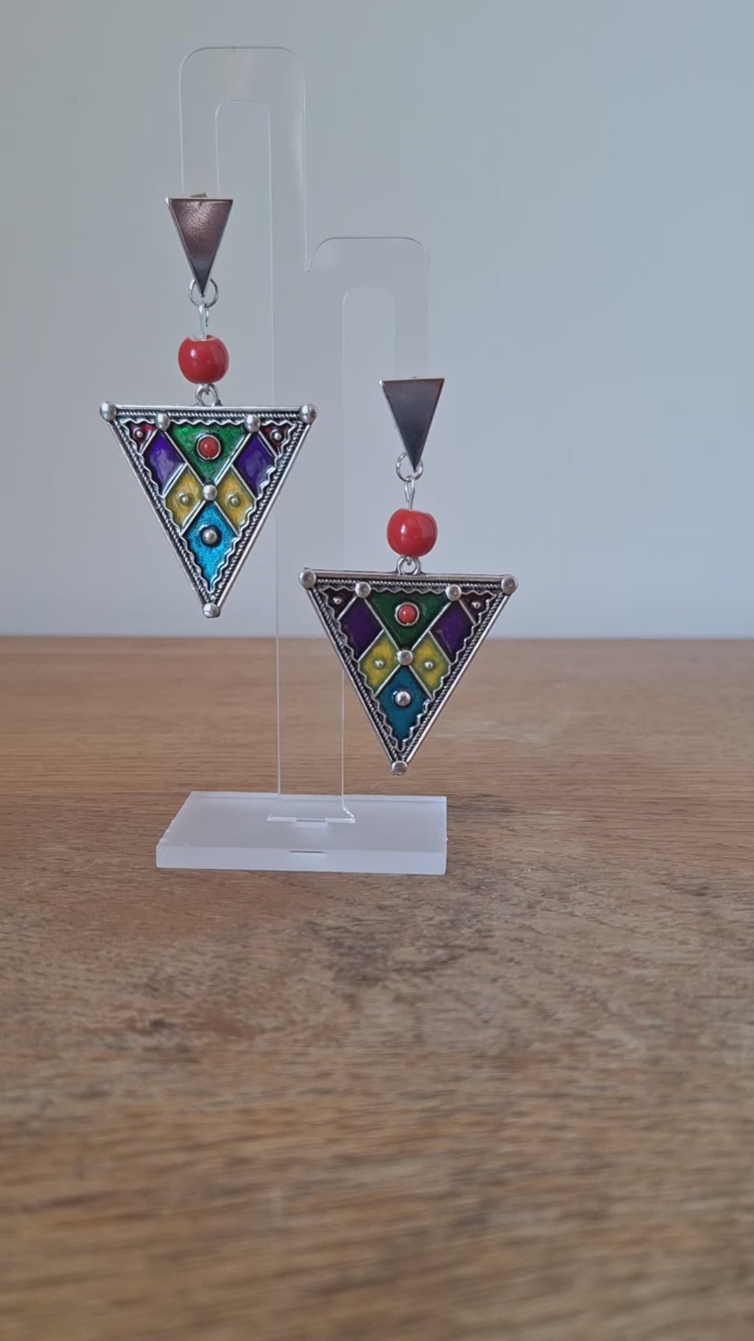 These Triangle Earrings are a bold and unique addition to your jewellery collection. Made from repurposed ceramic beads and large enamelled triangles, they boast a playful length of 70mm. Suspended from rhodium-plated triangle studs, they add a touch of quirk to any outfit.