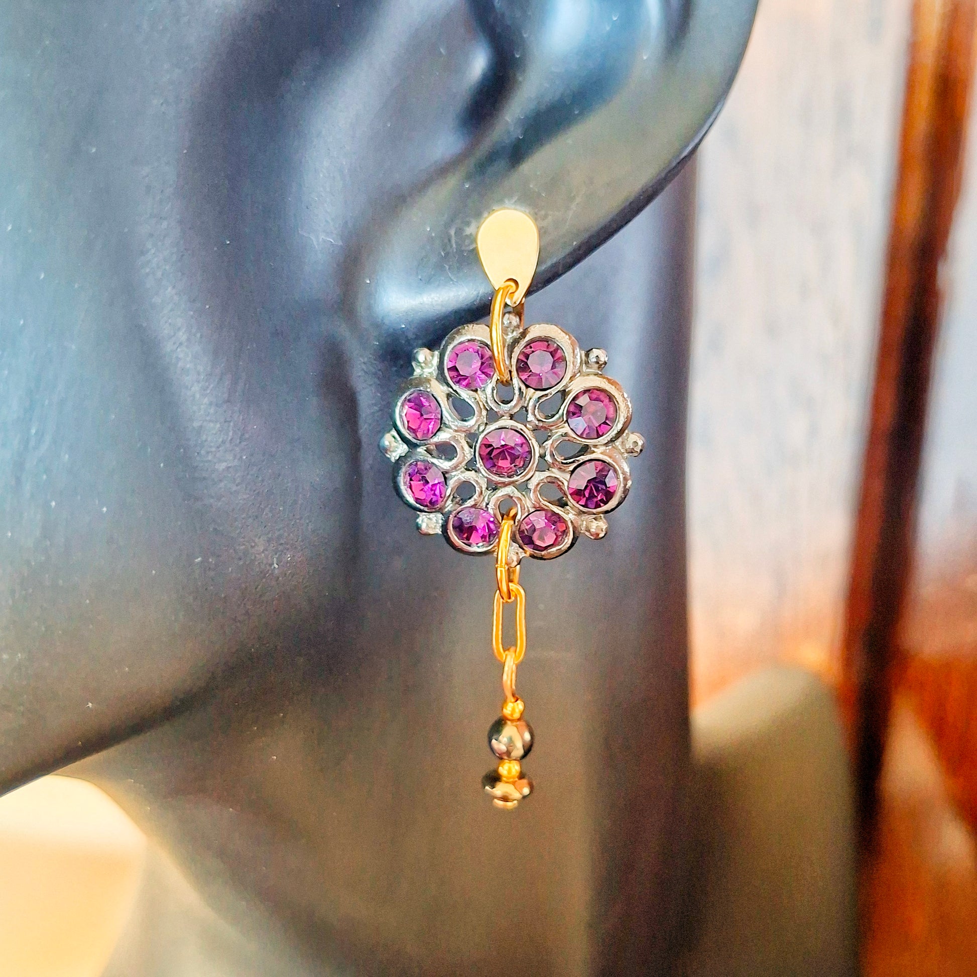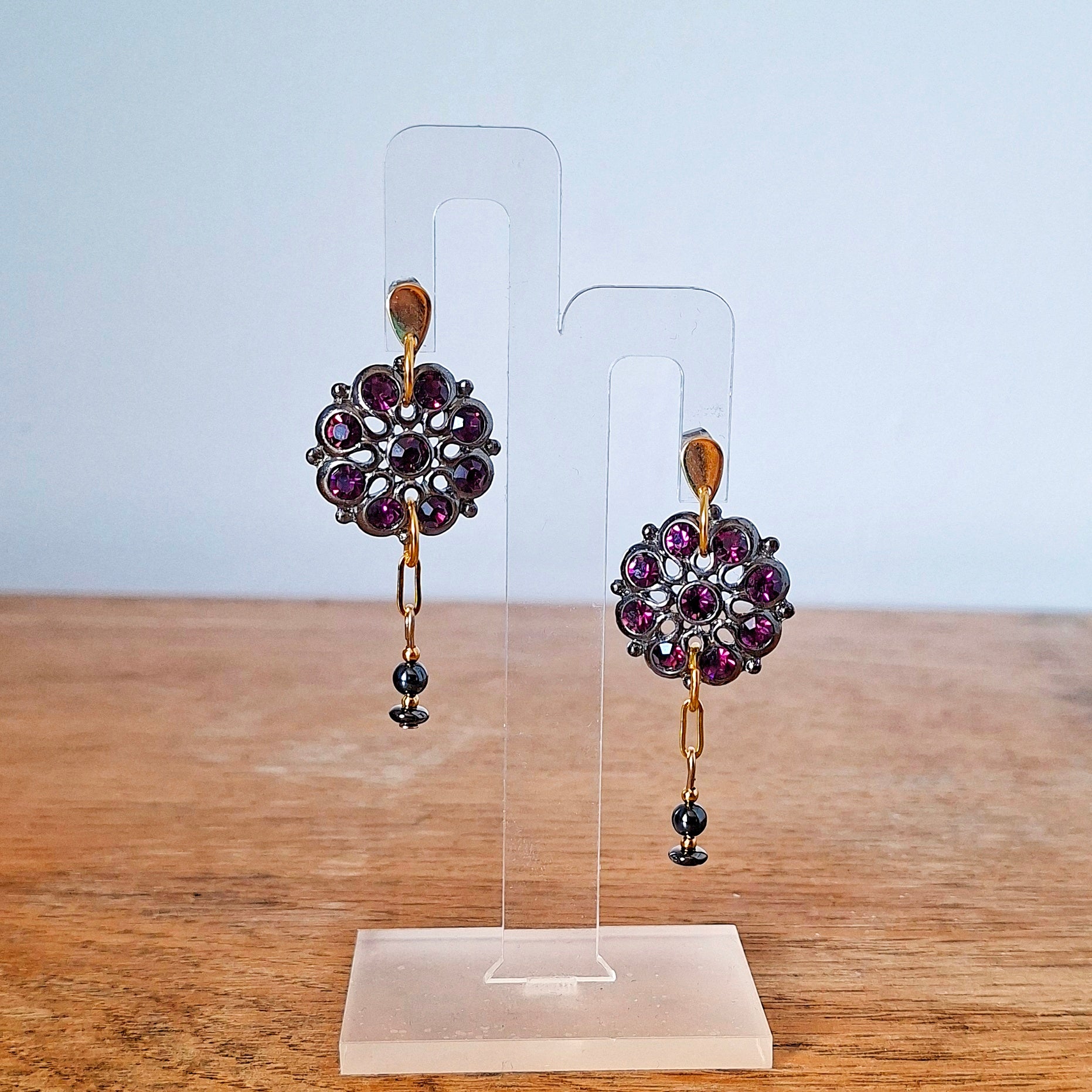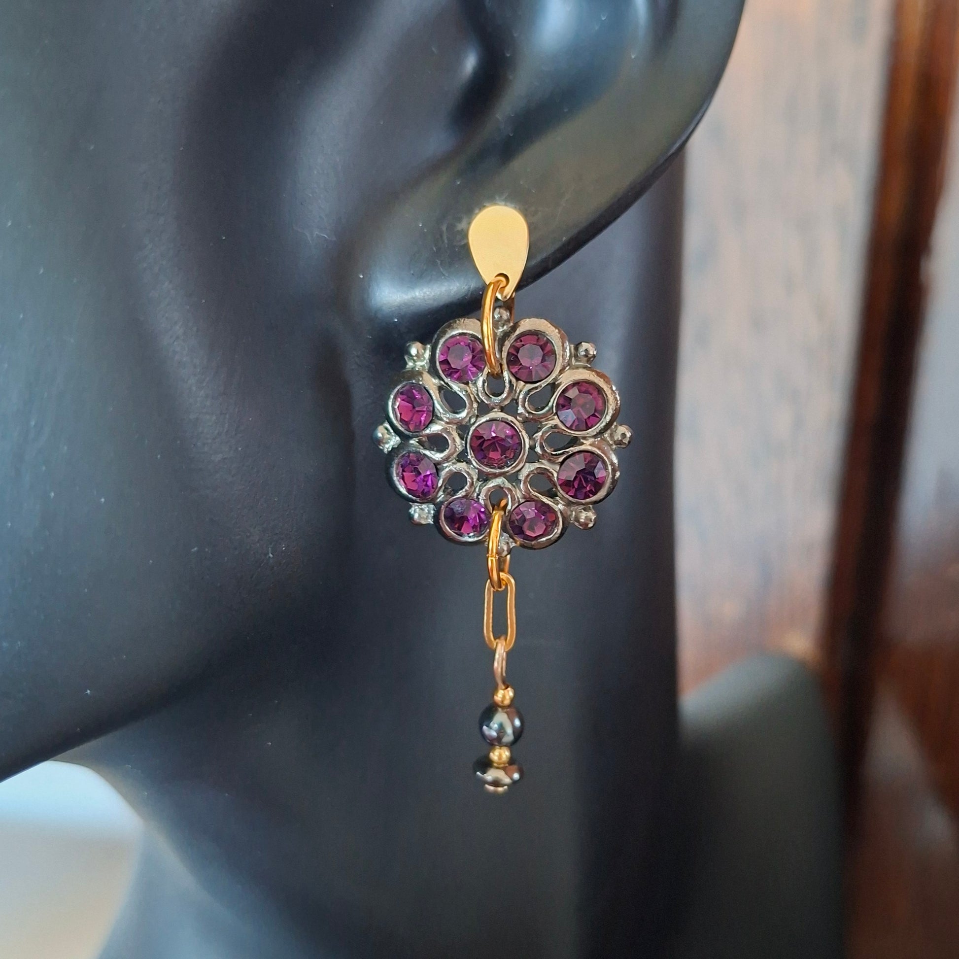 The vintage floral centrepiece catches the light with a deep, velvety sparkle, while the hematite drop adds just the right amount of moody elegance. Dramatic, and extremely wearable — the kind of earrings that get noticed without you having to flail your head around like you’re in a shampoo ad.