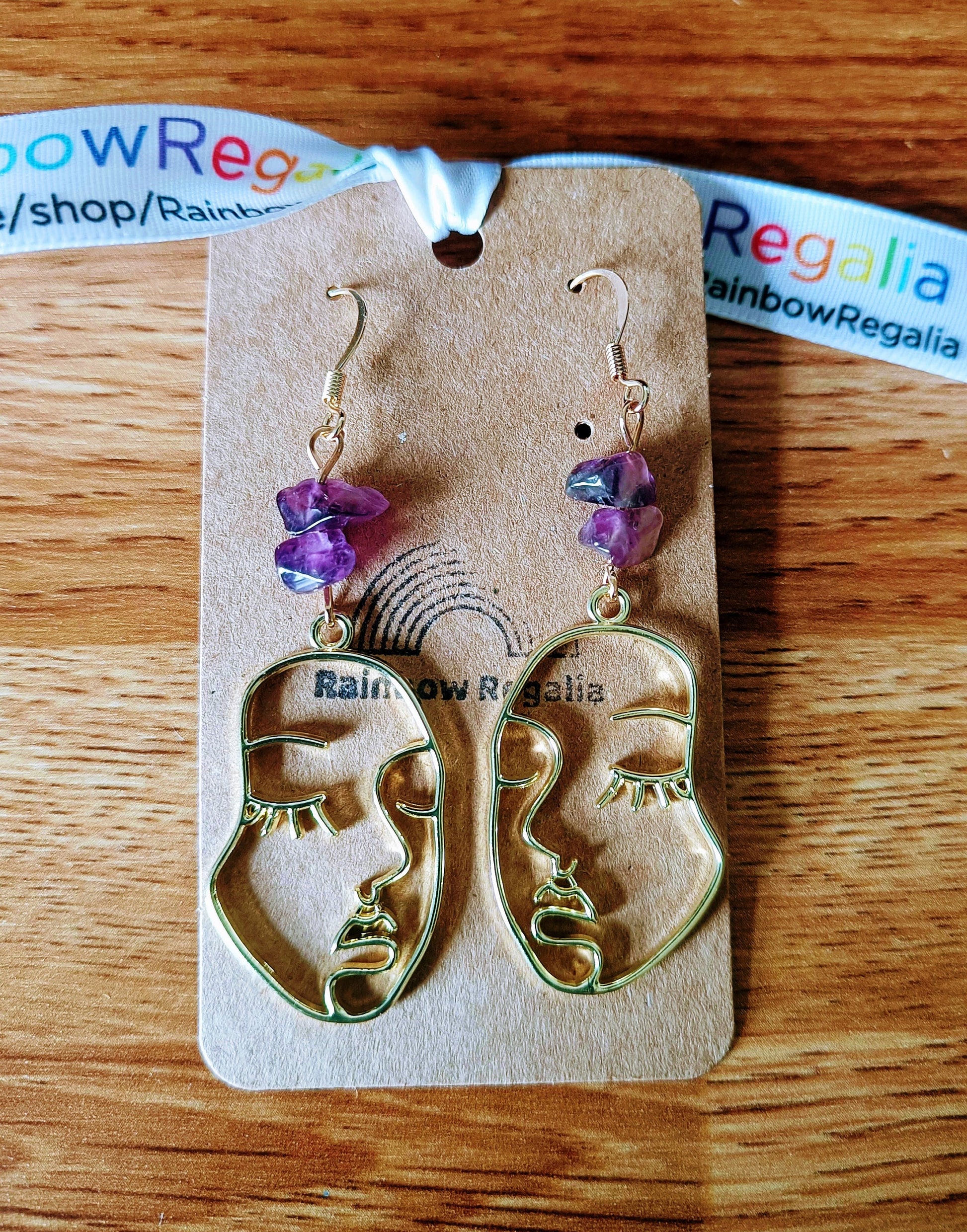 The repurposed genuine amethyst chips bring a touch of regal charm to these earrings, reflecting the depth and allure of the gemstone. The focal point is the antique gold plate abstract face, an enigmatic symbol of individuality and creativity, adding a unique touch of both character and style.