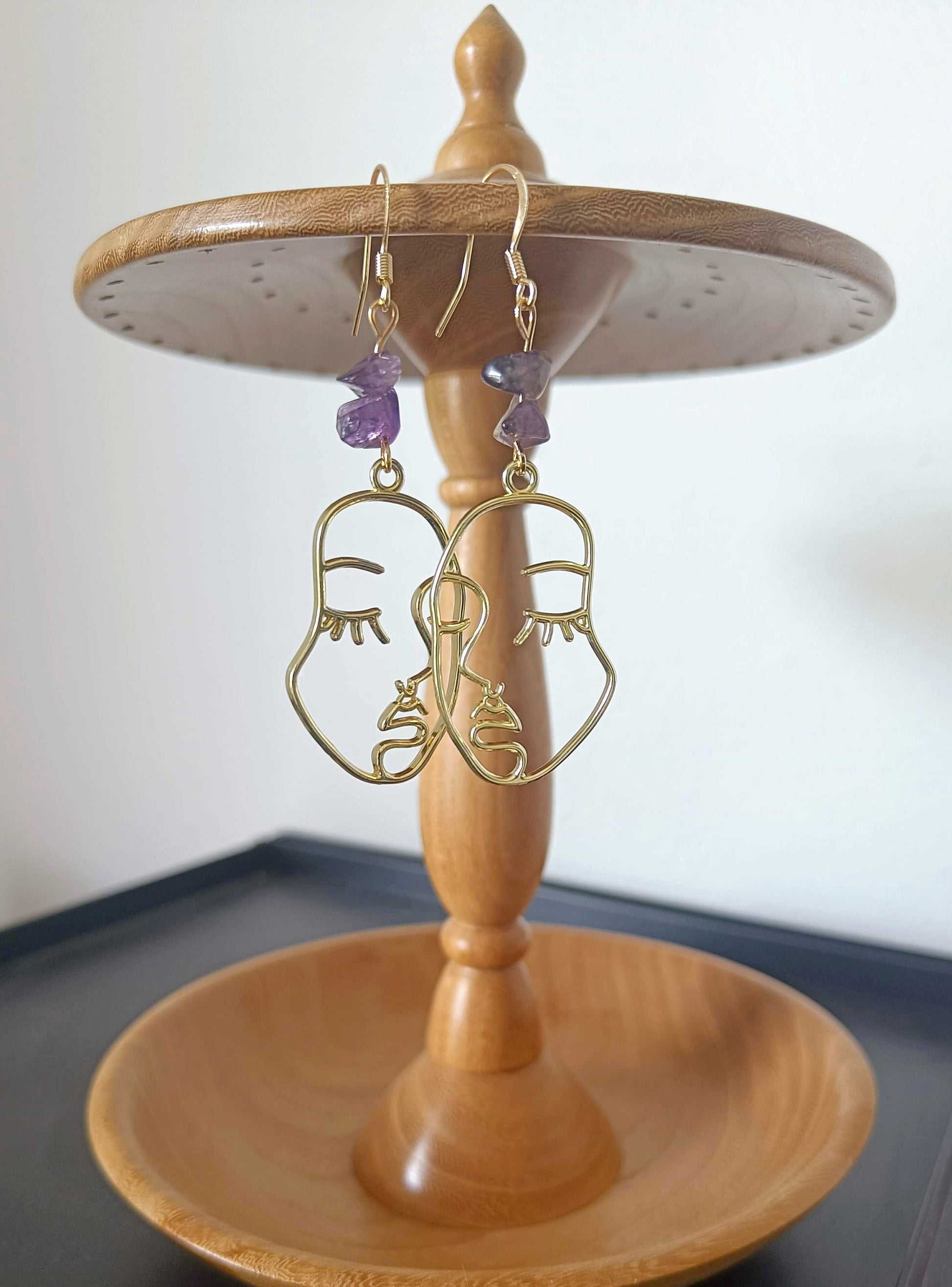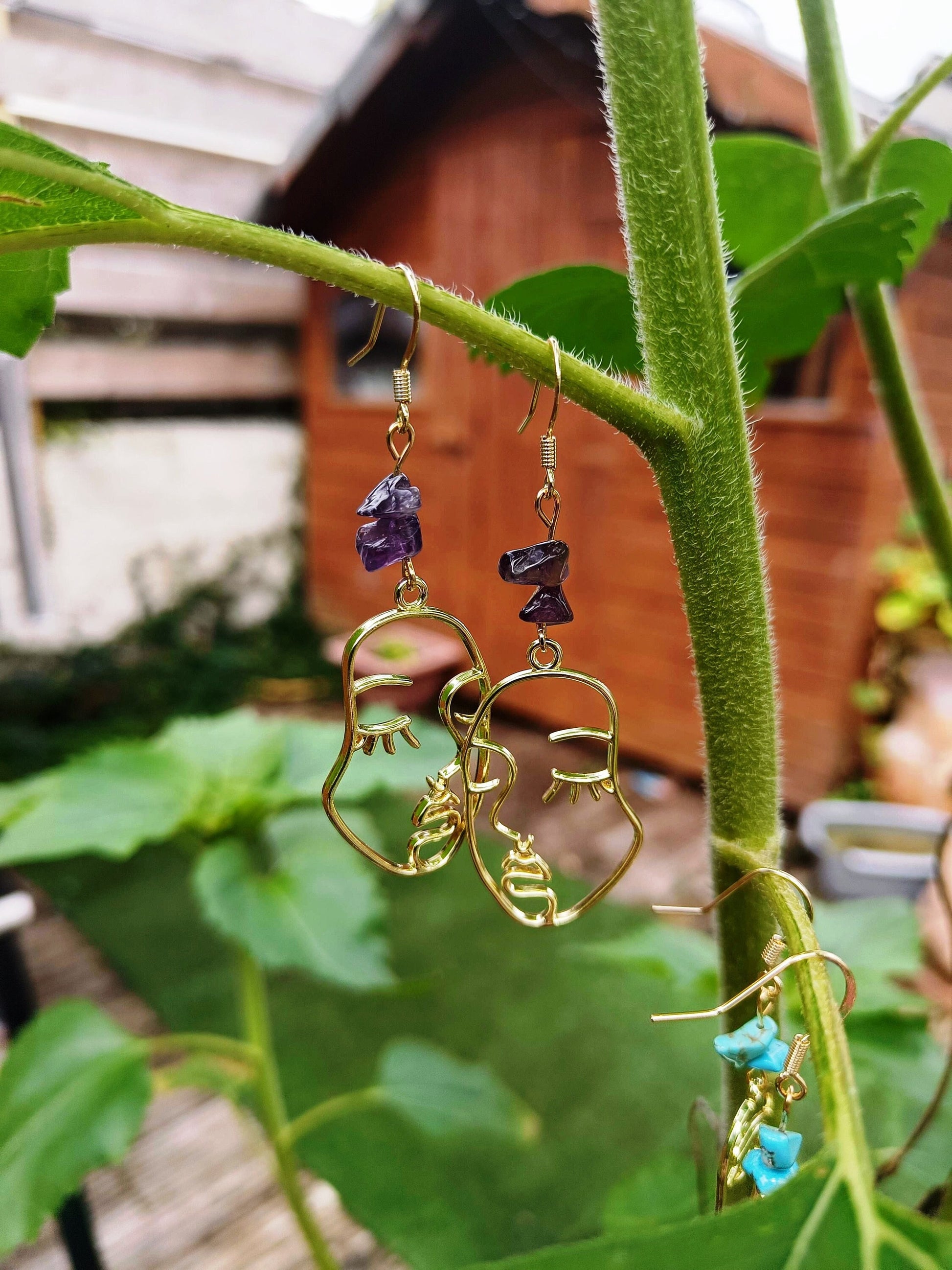 Elevate your style with these captivating dangle earrings, meticulously handcrafted using repurposed genuine amethyst chips and adorned with a striking large abstract face made with antique gold plate. Each earring is a fusion of natural beauty and artistic expression, seamlessly blending the allure of repurposed materials with a touch of avant-garde elegance.